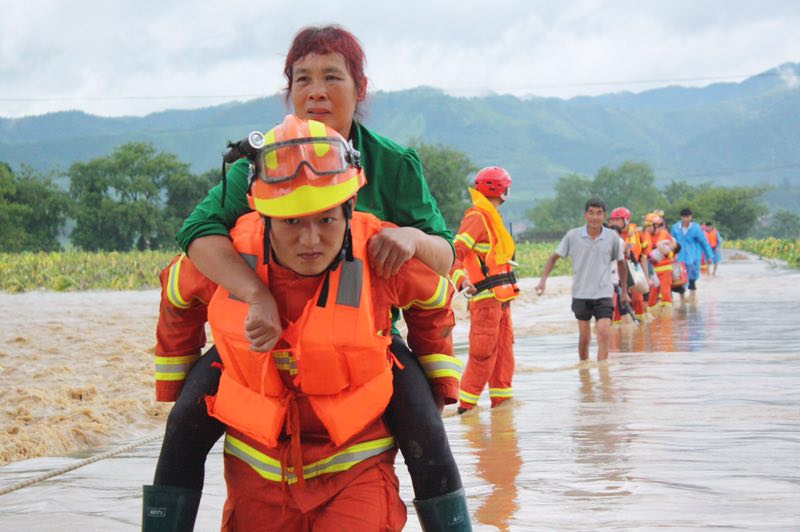 下午3时许,水位下降,何家村支部书记何泽辉、村主任阙国恒对村民进行劝离,并与镇应急队员、消防战士一道,顶着猛烈的洪水,在洪水中用身体在给群众拉起一条安全的撤离路线。